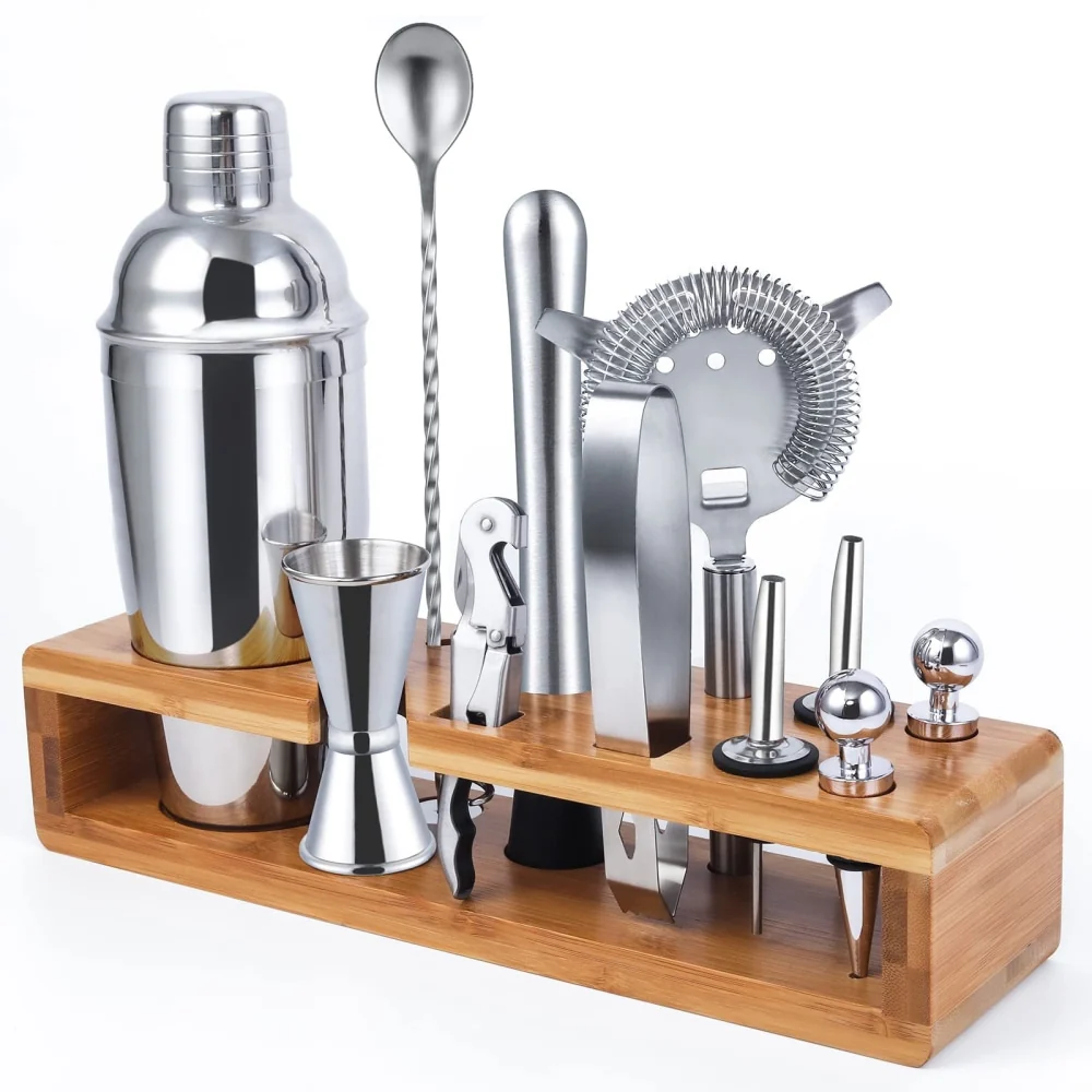 Bartender Kit with Bamboo Stand 12 Pcs Cocktail Shaker Set Steel Bar Tool Set